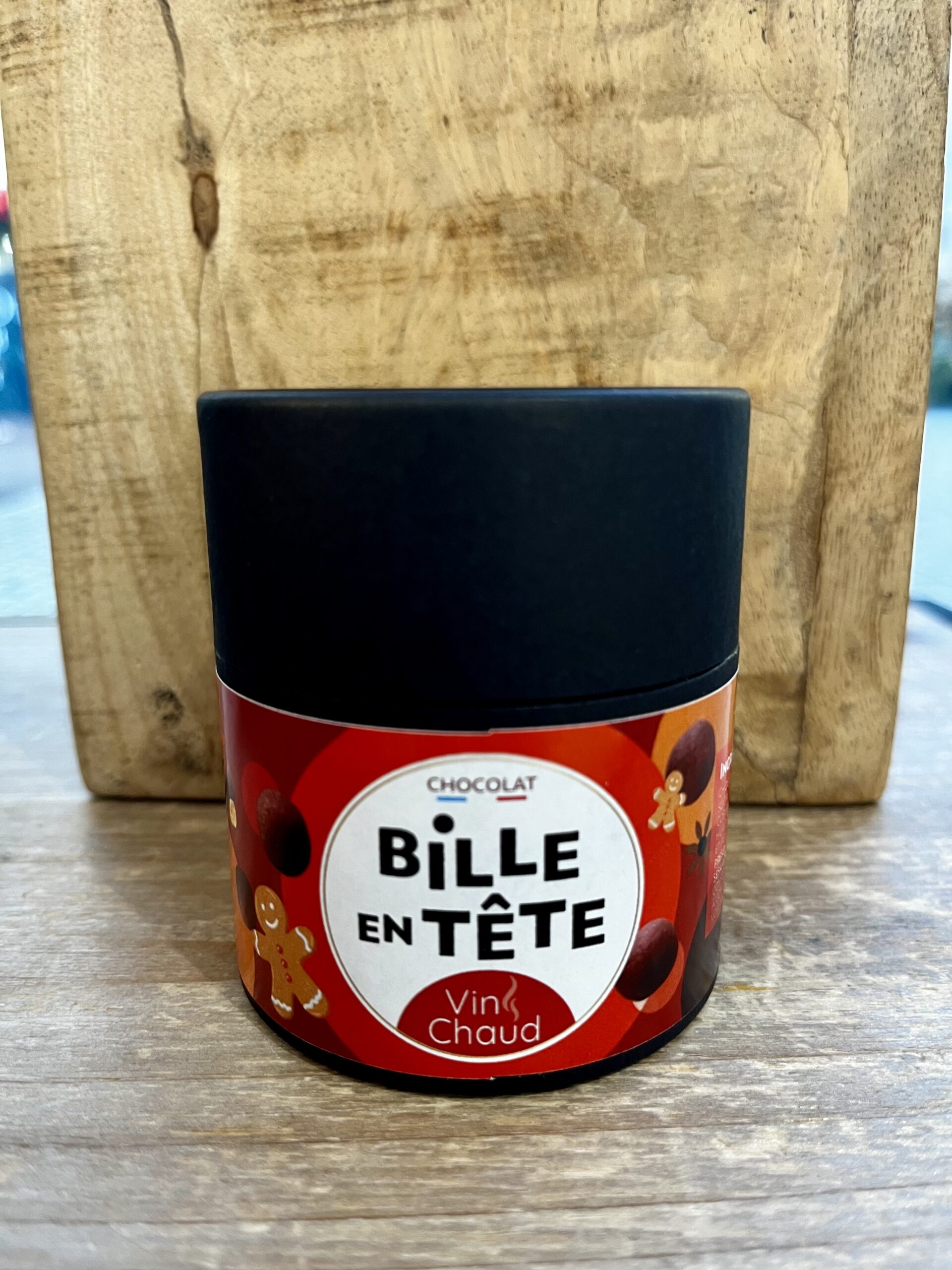 Chocolat noir 60% cacao (fève de cacao, sucre, lécithine de tournesol, vanille), coeur de céréales croustillantes, huile essentielle d’épices à vin chaud et poudre de vin. Présence possible de fruits a coque, soja, sésame, gluten.